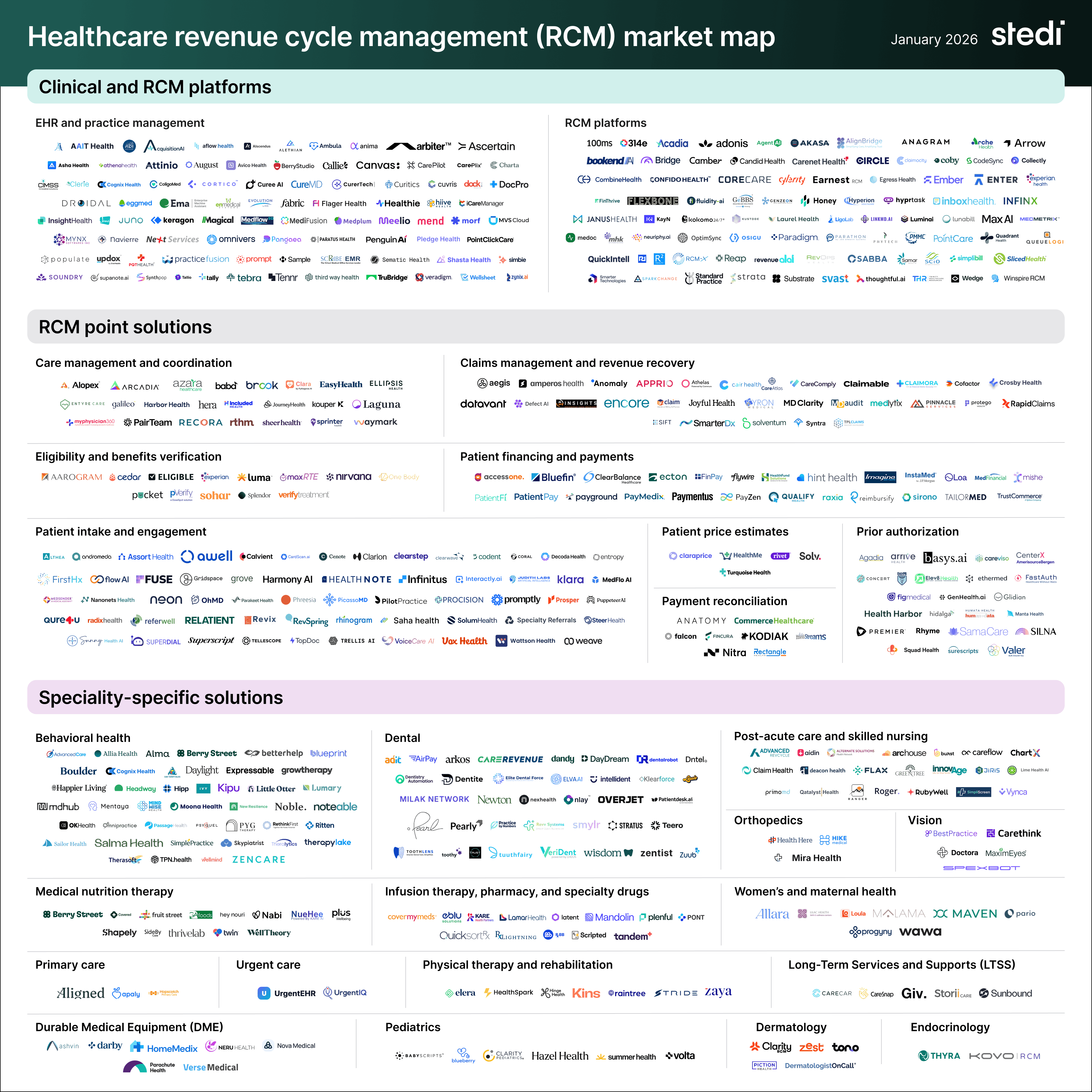 - Stedi’s RCM Market Map: Everyone loves a good market map, and Stedi just put out a great one for the white hot revenue cycle management landscape. The map covers over 500 companies, ranging from RCM platforms and EHRs to point solutions and specialty-specific tools. If you’re in the market for a new RCM solution, know someone who’s looking, or just want to be flabbergasted by the number of new entrants flooding this space – here’s the high-res version.